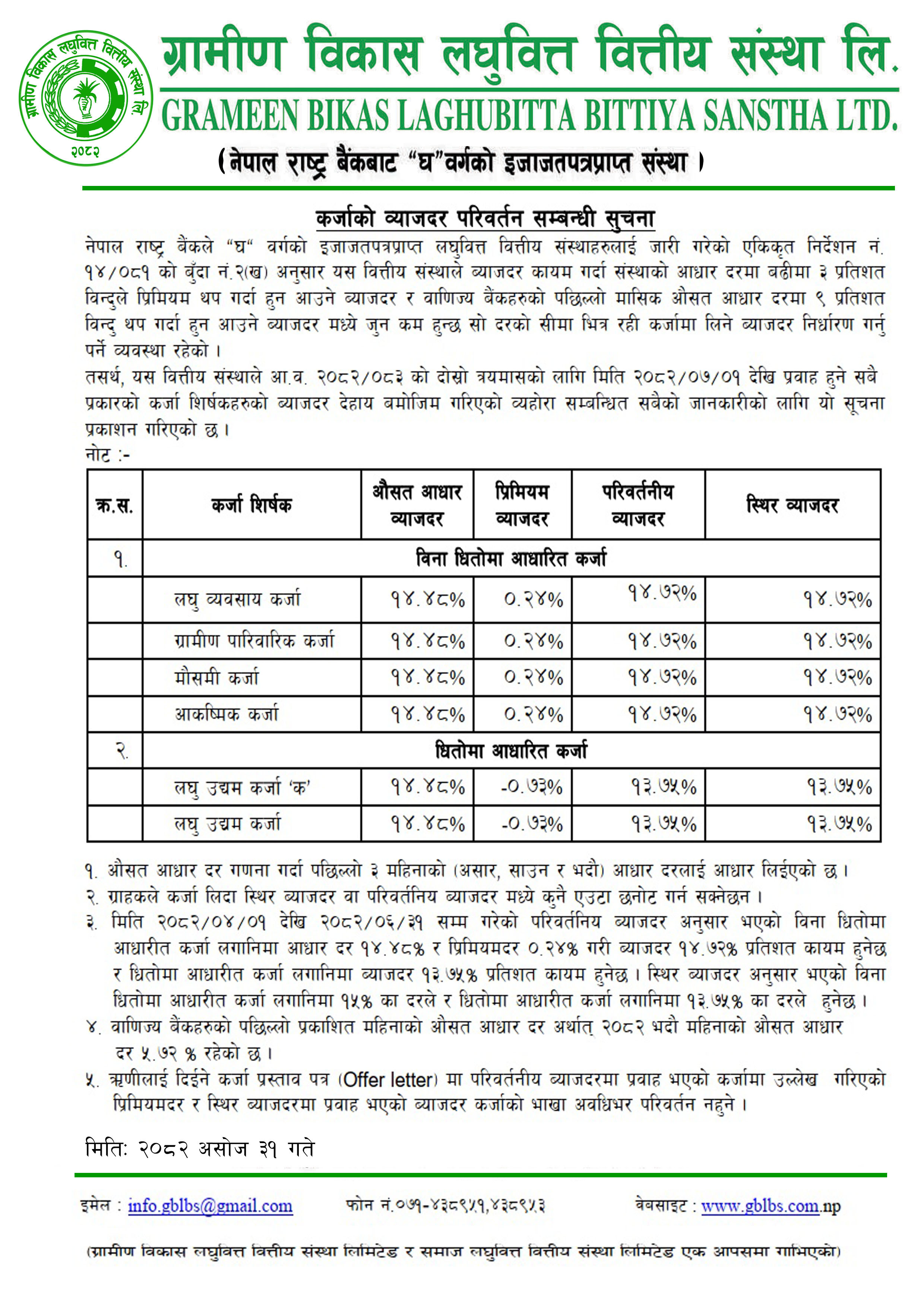 GBLBS was registered as a public limited company on 30th July 2014 (Shrawan 14, 2071) under the Company Act, 2063 and is regulated under the Bank and Financial Institution Act, 2073. The name “Nepal Grameen Bikas Bank Ltd.” was changed into “Grameen Bikas Laghubitta Bittiya Sanstha Ltd.” as per the decision of the Annual General Meeting of the institution and approval of the Office of the Company Registrar (approval date: 2074/12/28).