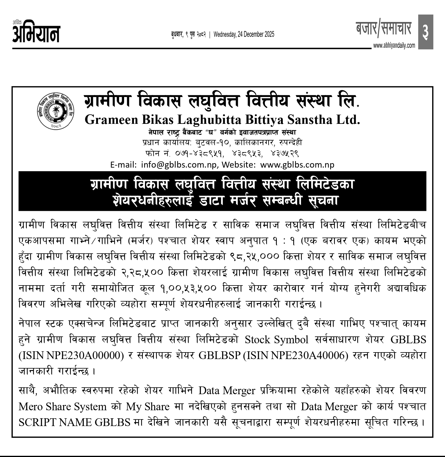 > ग्रामीण विकास लघुवित्त वित्तीय संस्था लिमिटेड र समाज लघुवित्त वित्तीय संस्था लिमिटेड एक आपसमा गाभिए पछि ग्रामीण विकास लघुवित्त वित्तीय संस्था लिमिटेडको नामबाट मिति २०८२ साल कार्तिक ०२ गते देखि एकीकृत वित्तीय कारोवार शुभारम्भ हुने बारेको सूचना।